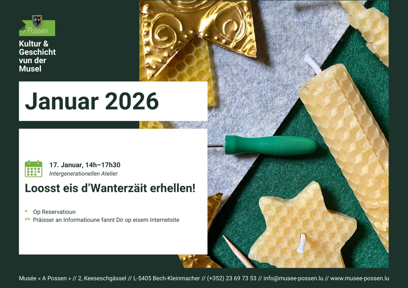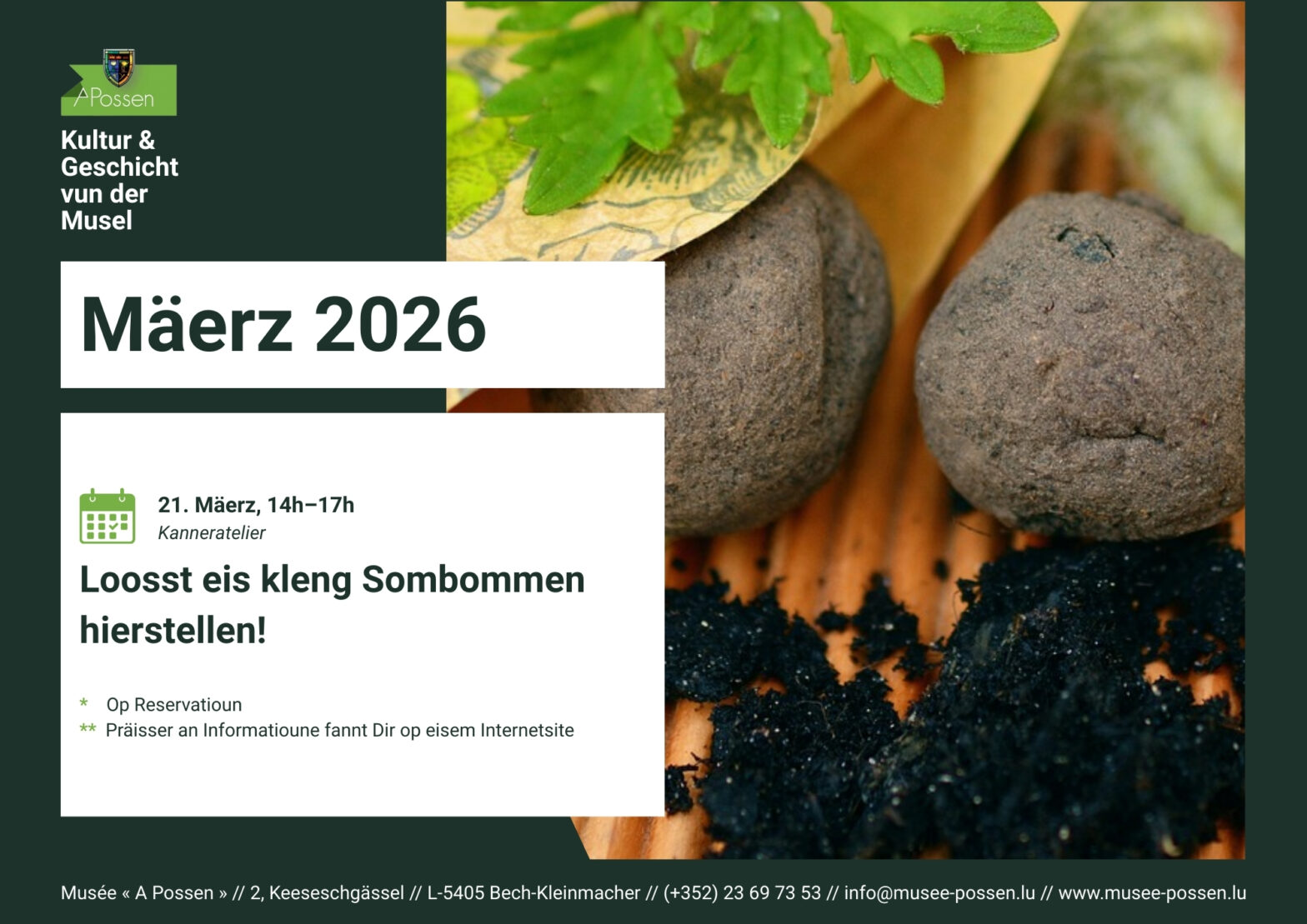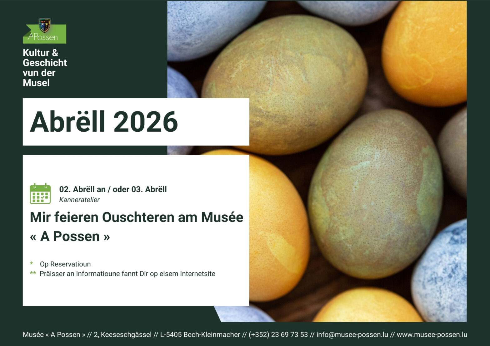 De Musée « A Possen » invitéiert Kanner tëscht 6 a 12 Joer op säin traditionellen Ouschteratelier, deen vum 2. bis den 3. Abrëll stattfënnt (et besteet keng Obligatioun un deenen zwee Deeg deelzehuelen). Den éischten Dag vum Atelier gëtt mat der Hëllef vun eiser Mediatrice en Ouschterkranz aus engem Wäisse-Kéis-Dech gebak. Dono ginn Eeër ënnert der Uwendung vun Naturmaterialien a Planze gefierft an unhand vu verschiddenen Techniken dekoréiert. Den zweeten Dag vum Atelier gëtt dann e passend Ouschternascht aus Stoff hiergestallt, woubäi d‘Technik vum Wiewen ugewant gëtt. Sou kann den Ouschterhues kommen!