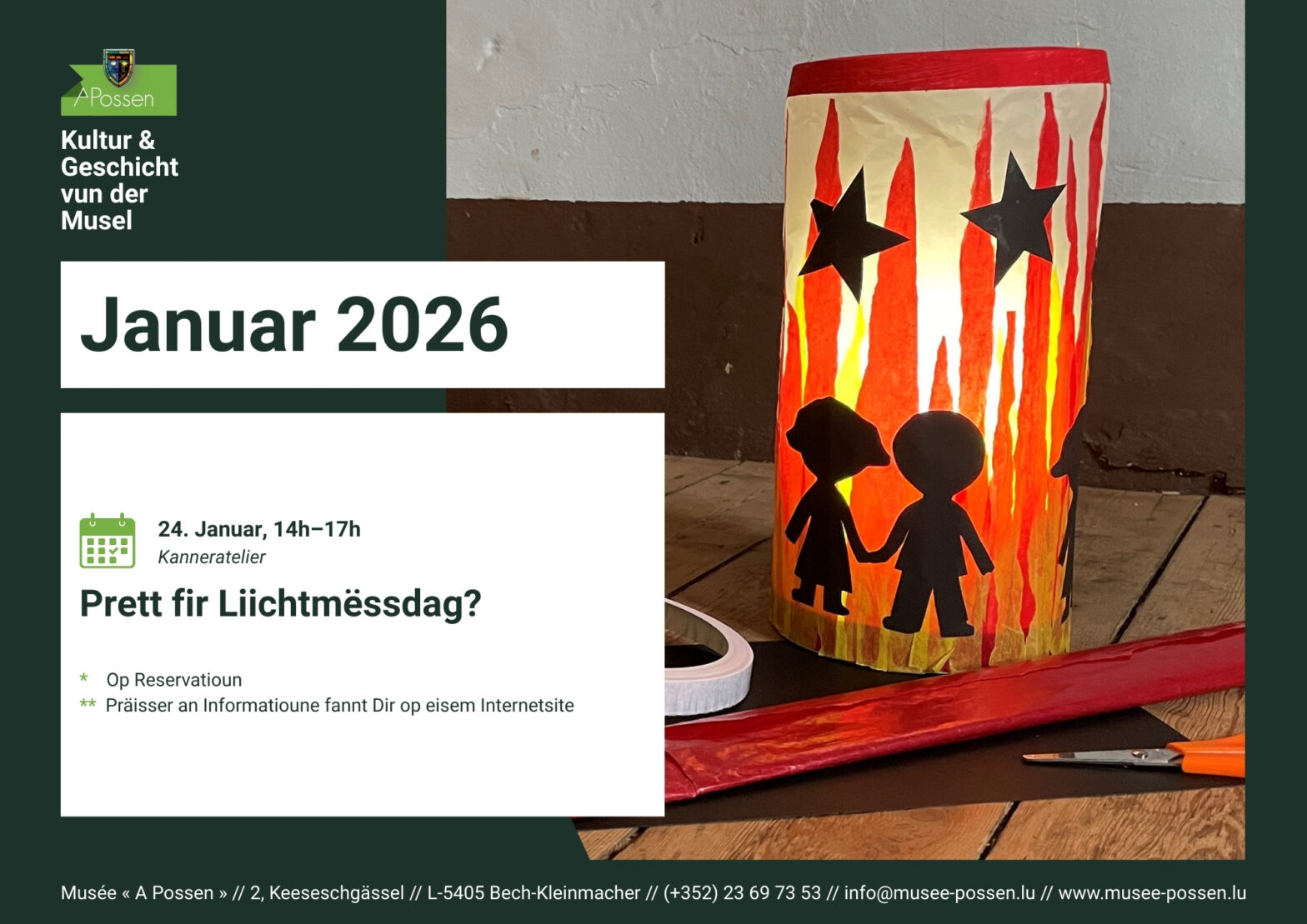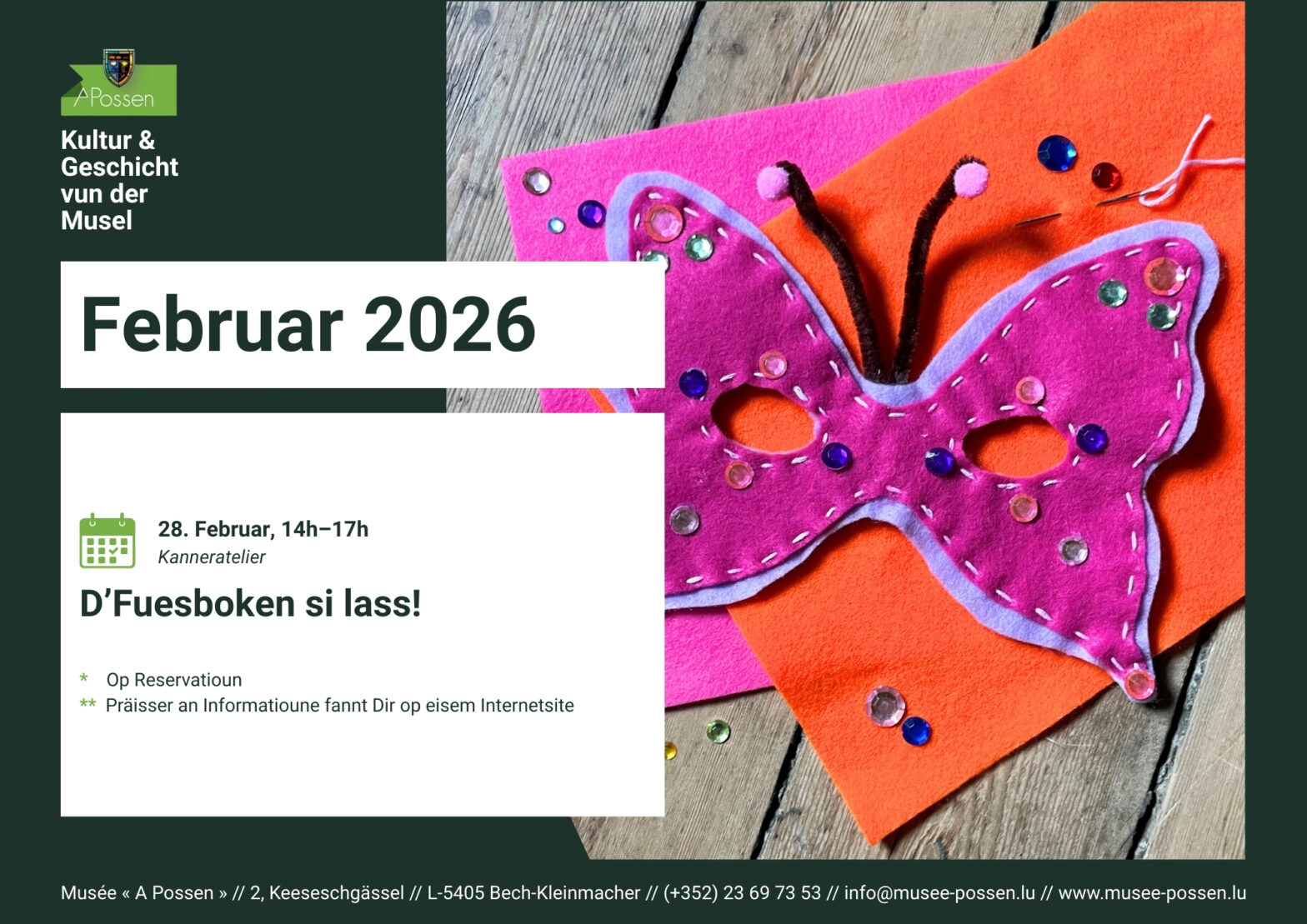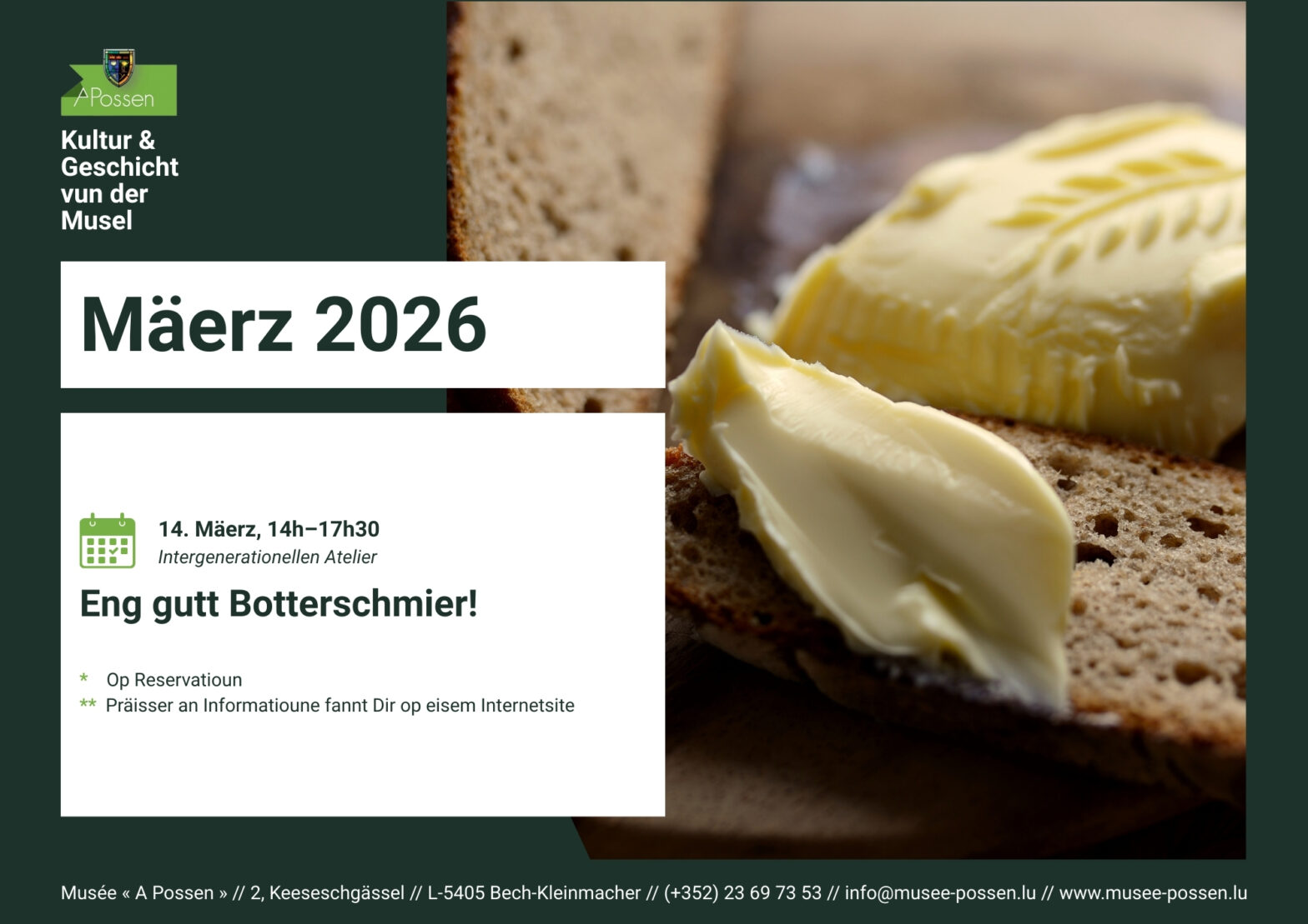 Eng Reservatioun ass obligatoresch per Telefon um +352 23 69 73 53 oder via E-Mail op [email protected].