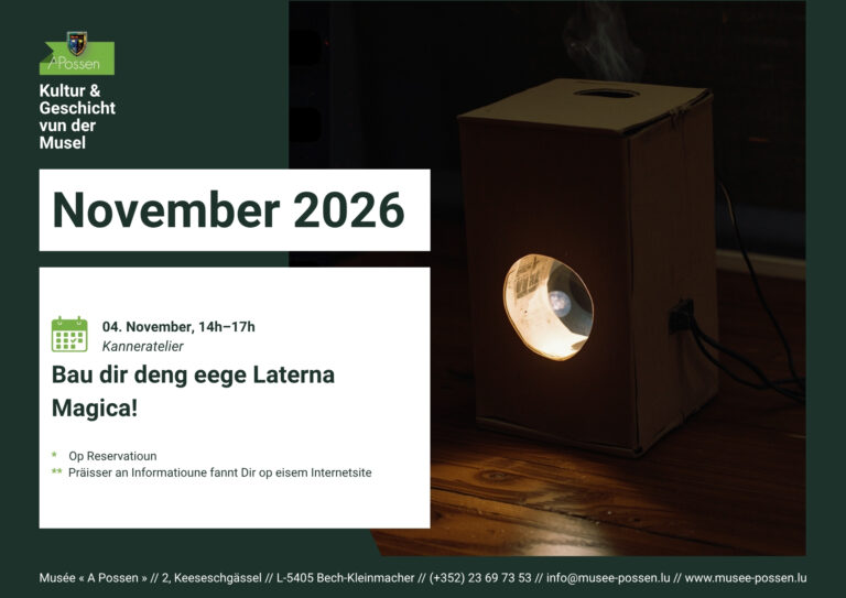 Mëttwochs, de 4. November, hunn d’Kanner tëscht 6 a 12 Joer d’Geleeënheet, e kreativen Nomëtteg am Musée « A Possen » ze erliewen, andeems si hir eege Laterna Magica bauen. Ënnert der Leedung vun enger Mediatrice bauen si als éischt hir Këscht, ier eng Lëns an déi selwer op transparent Folie gemoolte Biller agesat ginn. Doheem geet et dann duer, eng Täscheluucht ze benotzen, fir dëse „Projekter“ wéi fréier zum Liewen ze erwächen. En Atelier, an deem Kreativitéit, Wëssenschaft an d’Freed um Entdecken openeentreffen.