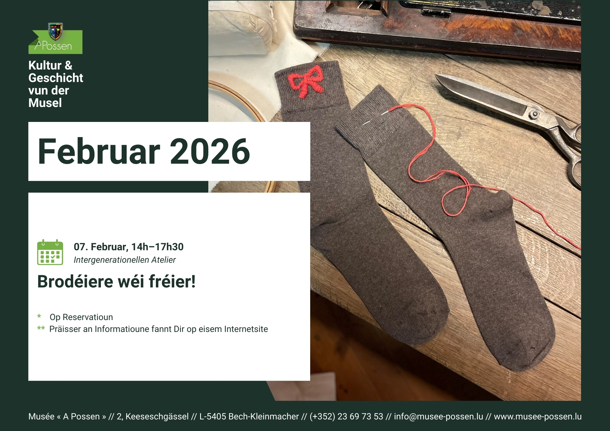 ONLINE TICKET 7. Februar - Brodéiere wéi fréier!« Brodéiere wéi fréier » wäert d’Thema vun eisem intergenerationellen Atelier vu Samschdes, de 7. Februar, sinn. Un der Säit vun eiser Mediatrice brodéieren a personaliséiere Kléng a Grouss (Kanner mussen a Begleedung vun engem Erwuessene sinn) hiert eegent puer Strëmp, sief et traditionell matt den eegenen Initialen, oder awerContinue reading "7. Februar – Brodéiere wéi fréier!"