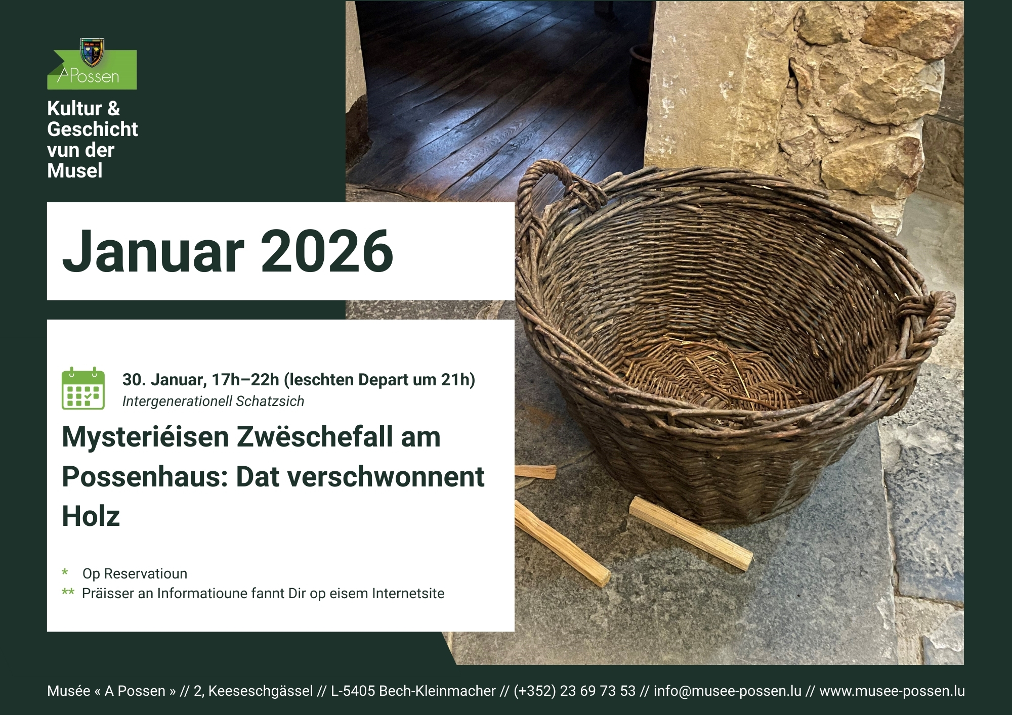 ONLINE TICKET 30. Januar - Mysteriéisen Zwëschefall am Possenhaus: Dat verschwonnent Holz Den 30. Januar, ab 17 Auer, si Kleng a Grouss (Kanner mussen a Begleedung vun engem Erwuessene sinn) invitéiert, eng immersiv Aventure am Häerz vum 19. Joerhonnert z‘erliewen! Am Duerf vu Bech-Maacher si d’Awunner:innen vum Possenhaus zréck doheem ukomm… ma wéi si d’DierContinue reading "30. Januar – Mysteriéisen Zwëschefall am Possenhaus: Dat verschwonnent Holz"